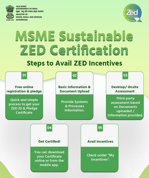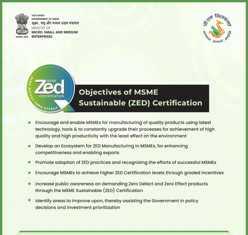 Micro, Small & Medium Enterprises , MSME Sustainable (ZED) Certification Scheme is an extensive drive to create awareness amongst MSMEs about Zero Defect Zero Effect (ZED) practices and motivate and incentivize them for ZED Cerficaon while also encouraging them to become MSME Champions in Sectors.